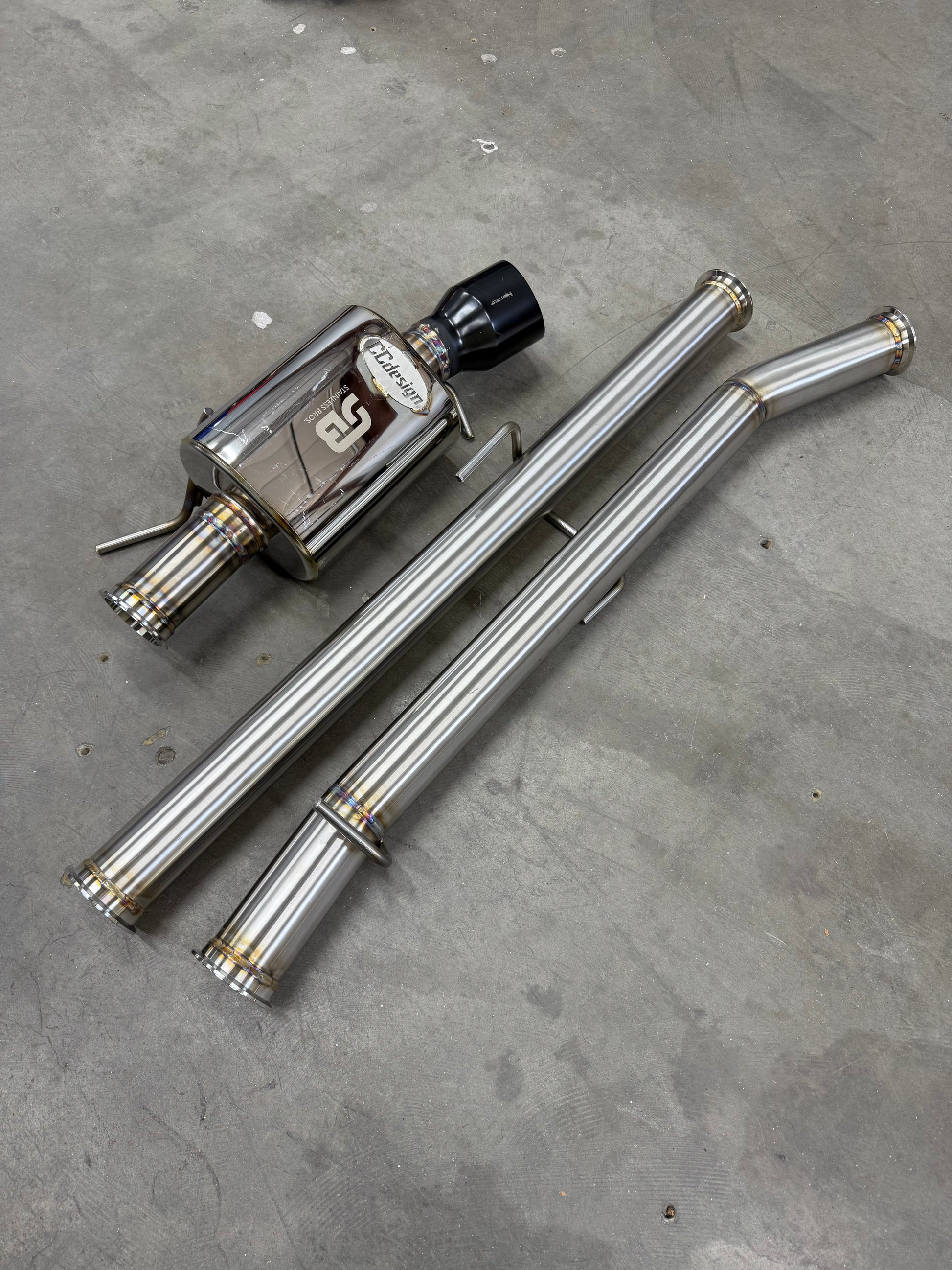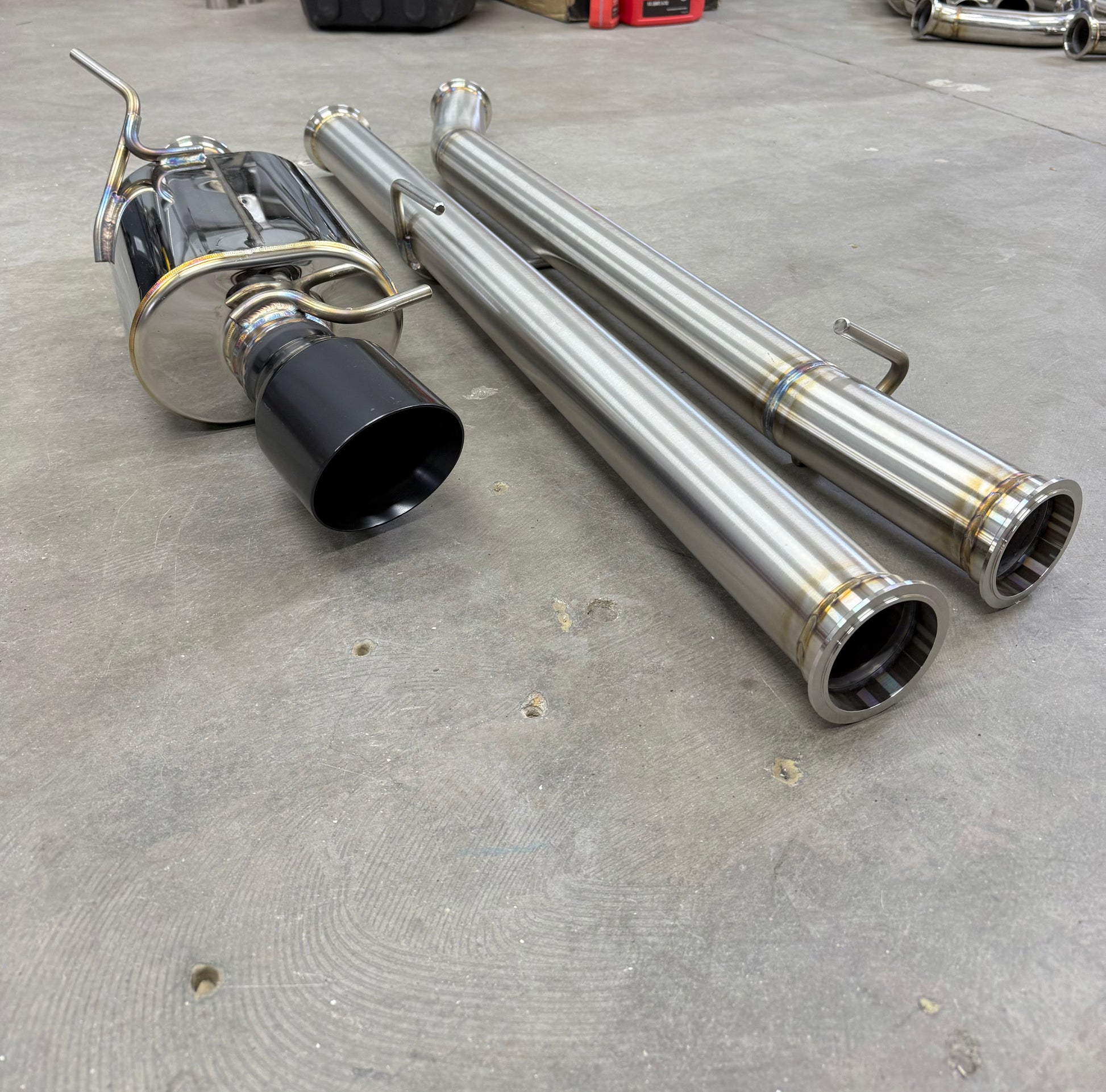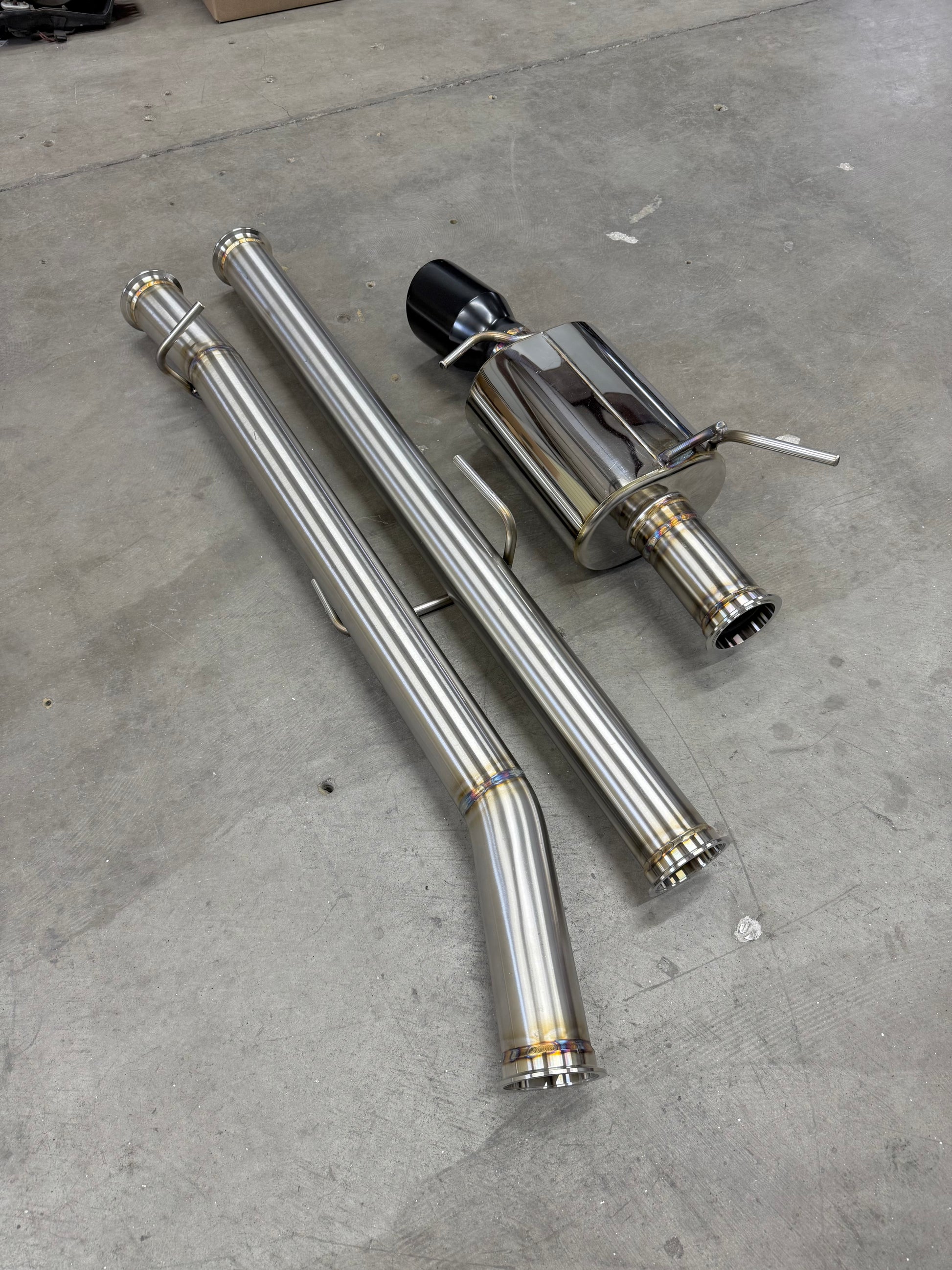 This is an exhaust system that goes from the downpipe back and replaces all the traditional 2-bolt flanges with V-band assemblies to provide better sealing throughout the system.